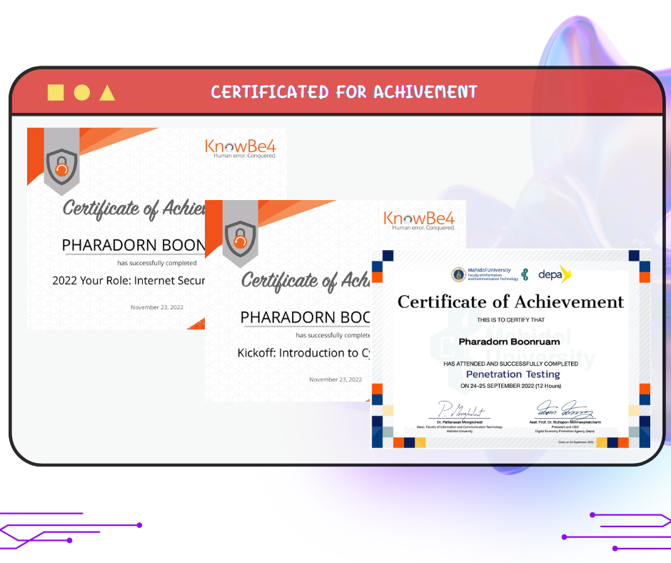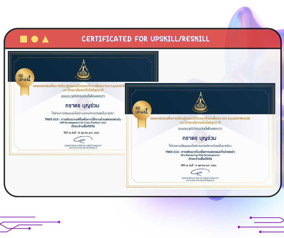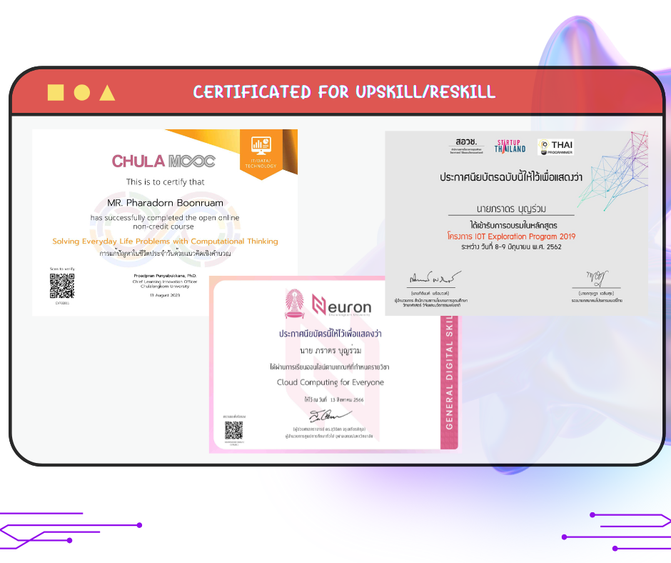 • I graduated from B.I.S. Bachelor Of Information Science ( Enterprise Software Program ) - Class Honours, School of Information Technology, Institute of Digital Technology at Suranaree University of Technology, Nakhon Ratchasima, THAILAND